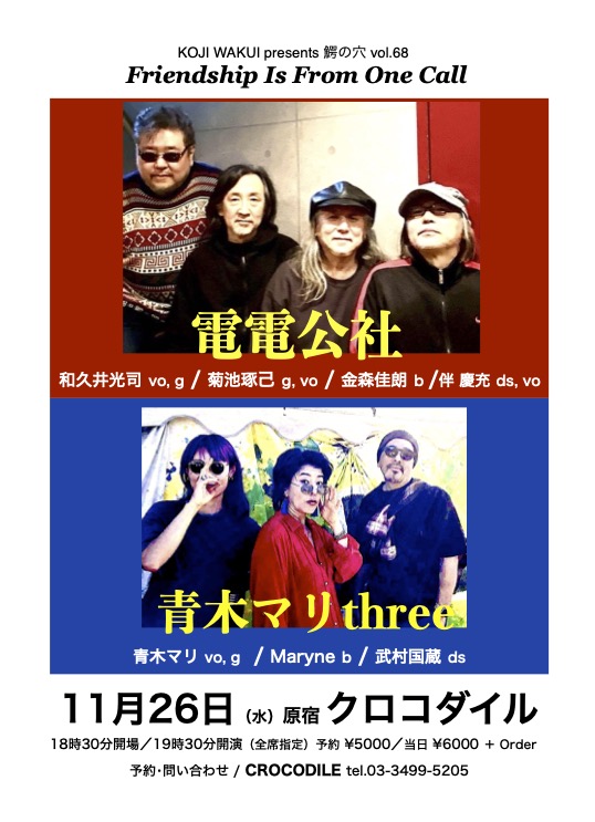 DATE & TIME2025/11/26(WED) OPEN 18:30 / START 19:30LOCATION原宿クロコダイルENTRANCE FEEAdv. ¥5,000 + 1drink / Day ¥6,000 + 1drink WITH電電公社PERFORM AS青木マリthree